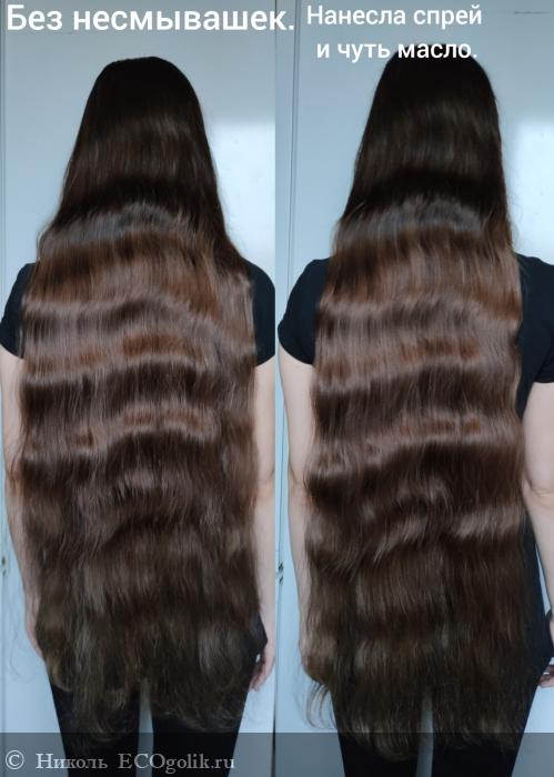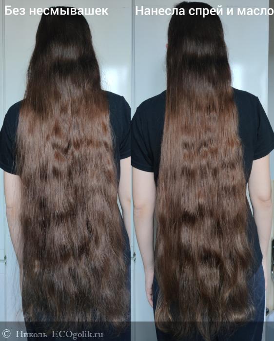 - Обладает разглаживающим эффектом, превращает длину волос в шёлковое полотно. Тут уже эффект с несмывашками: спрей + масло на двух фотографиях при дневном освещении.