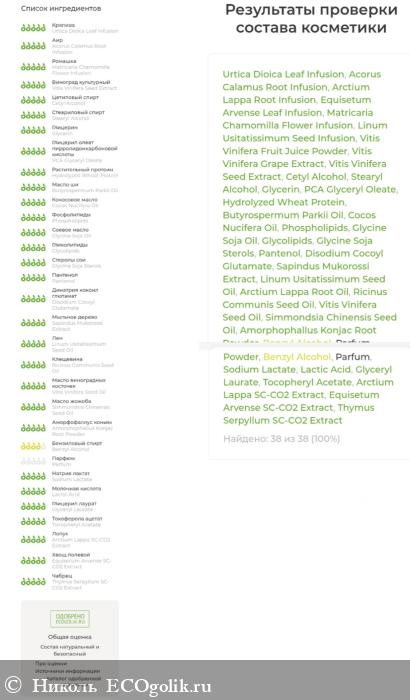 - Urtica Dioica Leaf (крапивы) Infusion - обладает антисептическими свойствами, стимулирует микроциркуляцию, нормализует секрецию, предотвращает выпадение волос, стимулирует рост волос, тонизирует кожу, обладает бактерицидным, себорегулирующим, дезодорирующим, противовоспалительным действиями. Помогает в борьбе с выпадением.