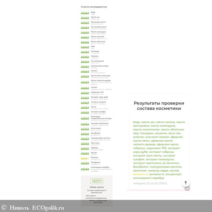 Состав шикарный. В нём нет силиконов, минерального масла, парабенов, искусственных красителей и консервантов, синтетических ароматизаторов. Всего 32 компонентая из них множество увлажняющих, регенерирующих, смягчающих, успокаивающих, антиоксидантных, антибактериальных ингредиентов.