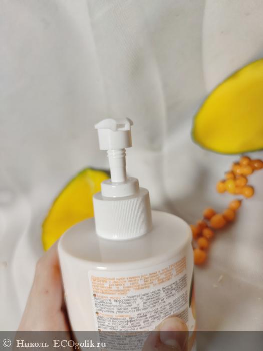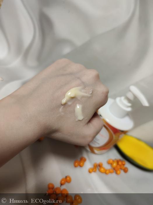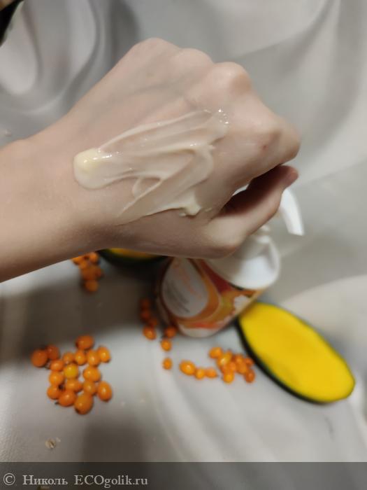 Крем не густой слишком, но и не жидкий, средней консистенции, плотности и густоты, имеющий светло-желтый, даже скорее больше светло-оранжевый цвет. Такой оттенок получается да счёт добавленного масло облепихи в состав. По консистенции, действительно, крем напомнил мне сливки, в которые добавили пюре облепихи и манго. (Я часто делаю тортики/различные пирожные, конфетки, булочки сладкие и варианты вкусняшек без сахара, и такая консистенция один в один, как моя начинка для тортика из блинчиков.)
