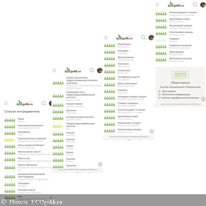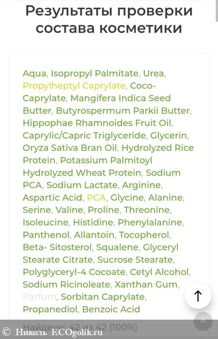 В составчике хочется выделить следующие компоненты, такие как: изопропилпальминат, мочевина, пропилгептил каприлат, коко-каприлат, масла (манго, ши, облепихи), каприлик/каприл триглицериды, глицерин, рисовое молочко, комплекс аминокислот, пантенол, аллантоин, токобиол С, натуральные эмульгаторы.