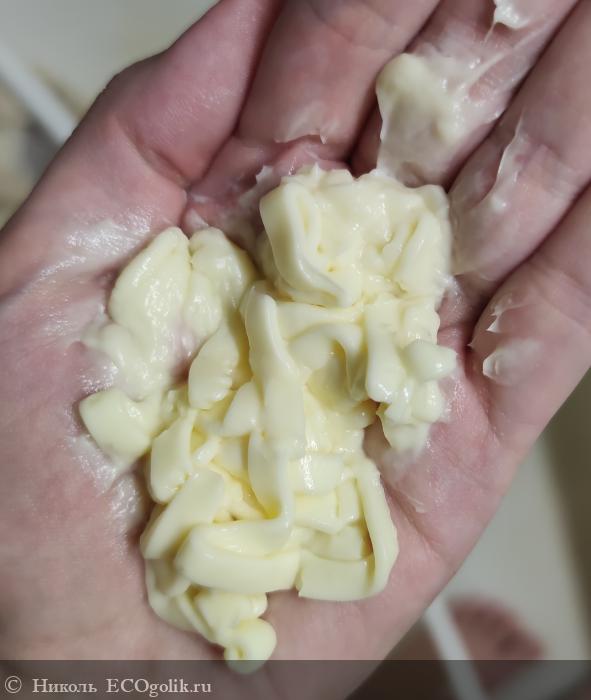 Консистенция у маски густая и плотная, она однородной кремовой текстуры лимонного оттенка.