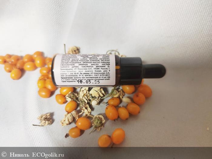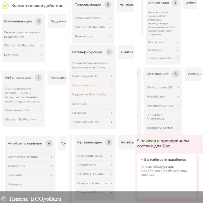 Состав шикарный. Он богат на полезные компоненты. В нём нет: силиконов, минерального масла, продуктов животного происхождения, искуственных красителей, консервантов, синтетических ароматизаторов. В составе присутствуют такие классные компоненты: масло оливы, гексилдеканол, гексилдецила лаурат, эфирные масла (лайма, узколистной лаванды, листьев чайного дерева), экстракты (облепихи, цветков ромашки аптечной, листьев розмарина), витамин Е.