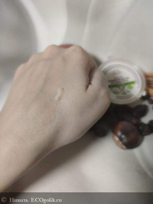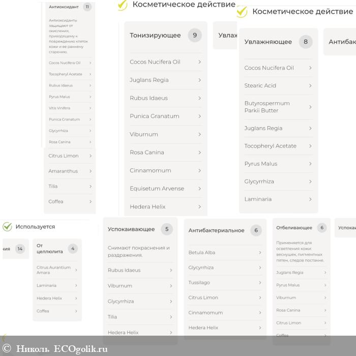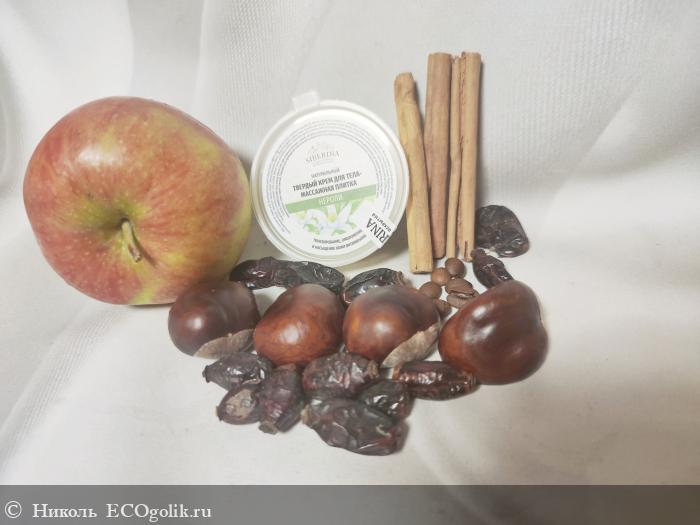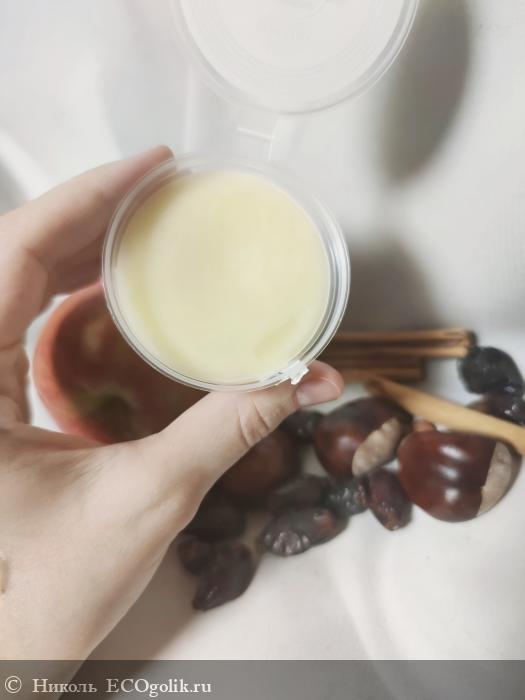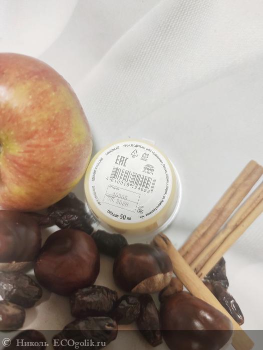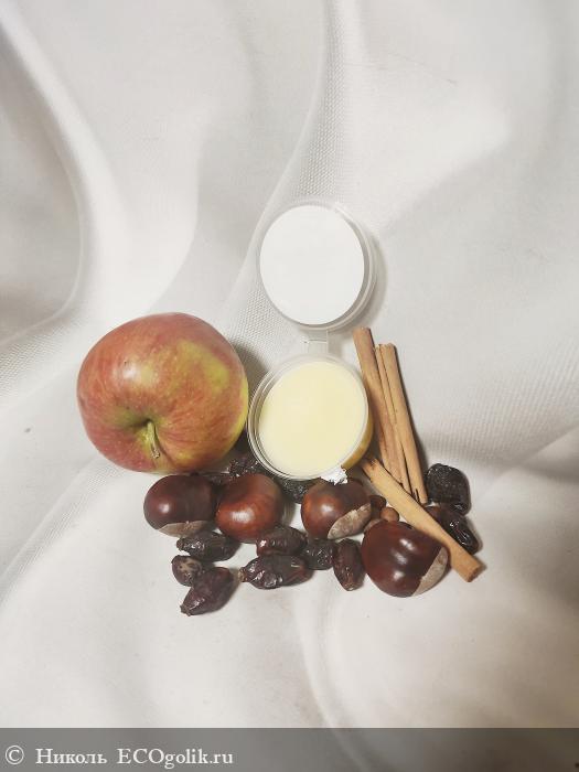 Состав замечательный, он состоит из 27 компонентов. В нём: 3 масла (кокоса, ши, грецкого ореха), стеариновая кислота, витамин Е, 2 эфирных масла (нероли и мирта), 20 экстрактов (малины, яблока, винограда, граната, калины, коры березы, солодки, шиповника, мать-и-мачехи, лимона, корицы, облепихи, амаранта, липы, фукуса, ламинарии, конского каштана, хвоща, плюща, кофе). В составе нет: плёнкообразователей, силиконов, продуктов животного происхождения, искуственных красителей, консервантов, синтетических ароматизаторов.