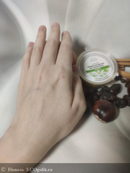 Твёрдый крем-масло можно сразу носить на кожу, но я чаще всего беру небольшое количество ногтем или шпателем и потом распределяю ладошками по коже рук. Если на ноги наношу, то прохожусь непосредственно массажной плиткой по коже ножек. От шпателя/ногтя остаётся след на средстве.