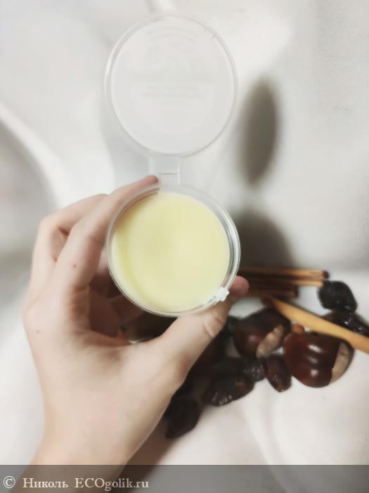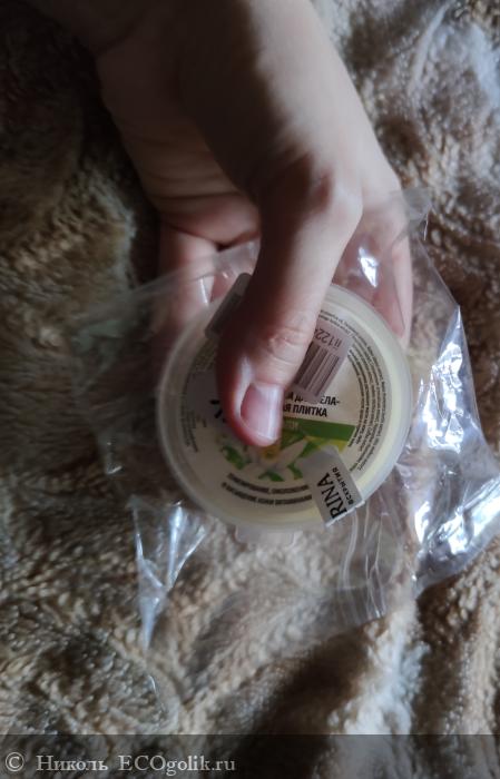 Массажная плитка хранится в пластиковой баночке, на которую наклеена влагоустойчивая наклейка со всей информацией об этом твёрдом крем-масле. Такой формат средства для тела я пробую впервые.