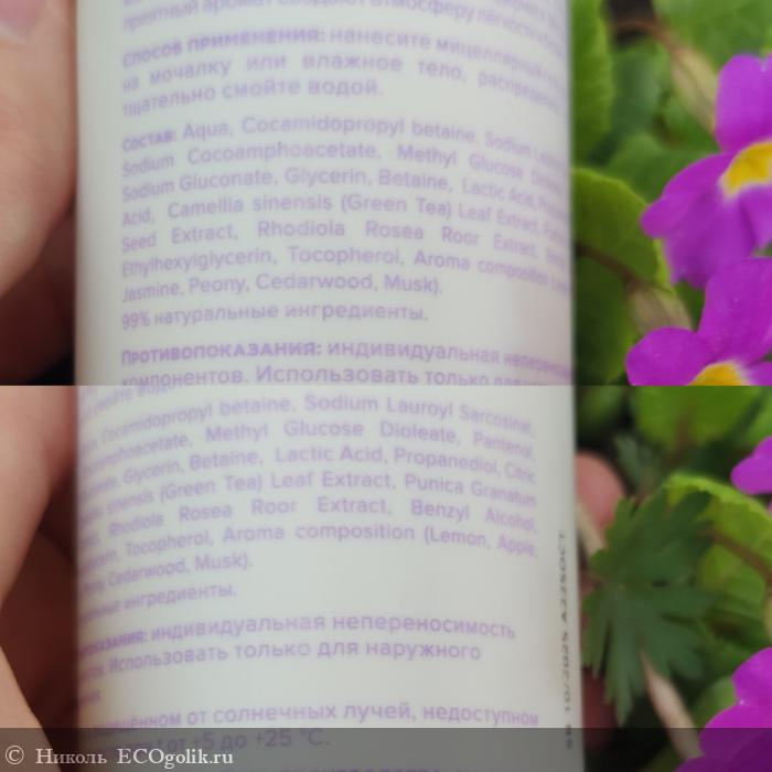 - Способ применения: нанесите мицеллярный гель для душа на мочалку или влажное тело, распределите по телу и тщательно смойте водой.