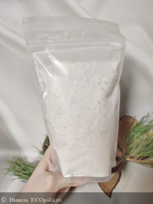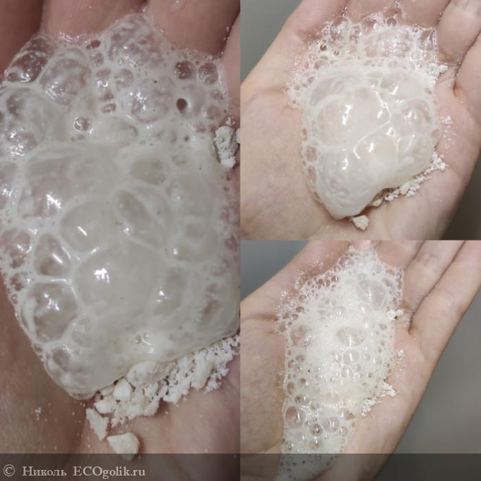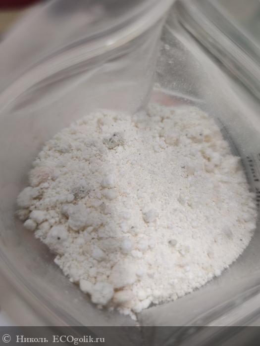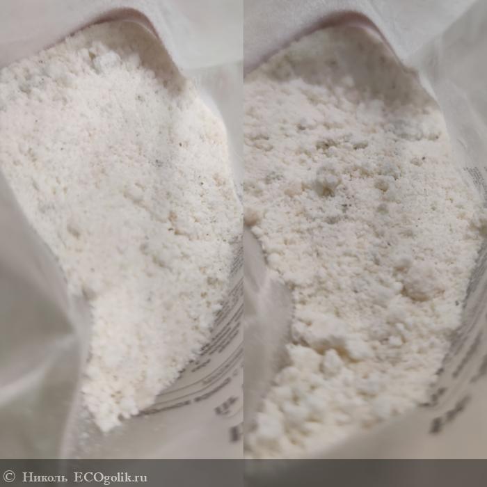 Порошочек рассыпчатый и нежный. На ощупь, это как сухие, кокосовые сливки, перемешанные с кукурузным крахмалом с добавлением соды.