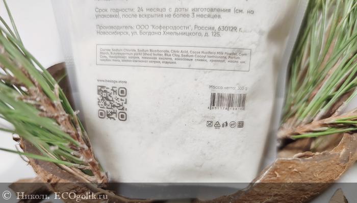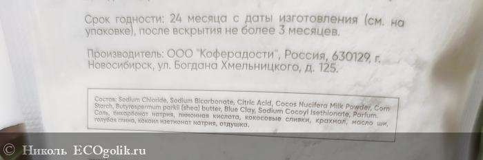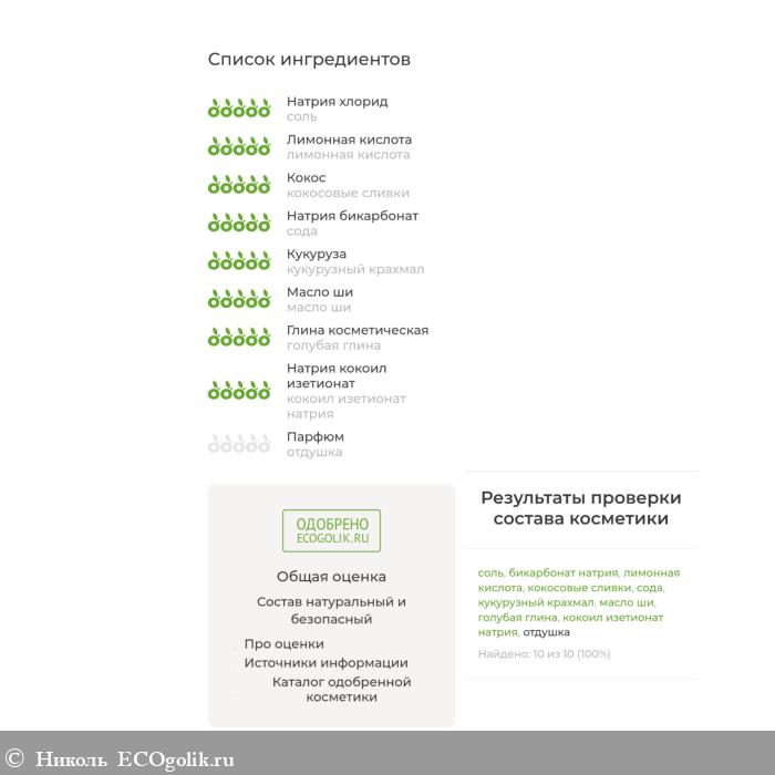 Состав хороший. В нём 9 компонентов, имеется такие ингредиенты, как: соль, бикарбонат натрия, лимонная кислота, кокосовые сливки, сода, кукурузный крахмал, масло ши, голубая глина, кокоил изетионат натрия, отдушка.