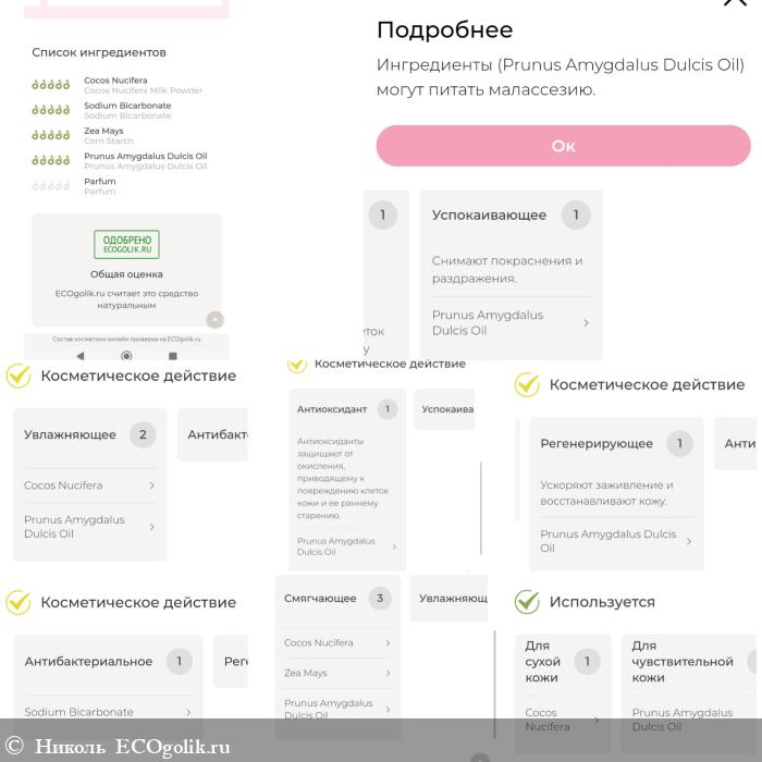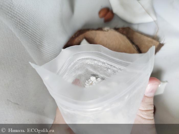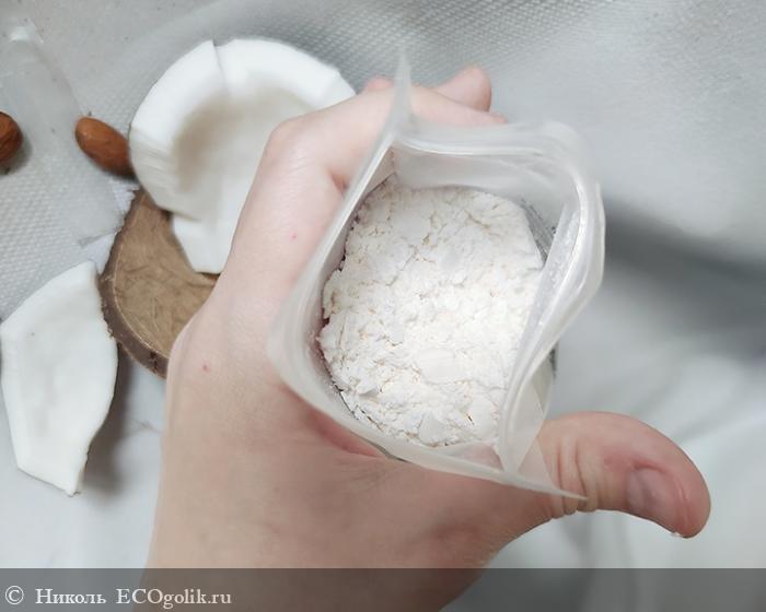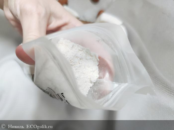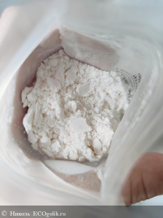 Этот уходовый продукт представляет собой порошок белого цвета. Помол имеет мелкий, в текстуре твёрдых комков нет, сам порошочек рассыпчатый и нежный.