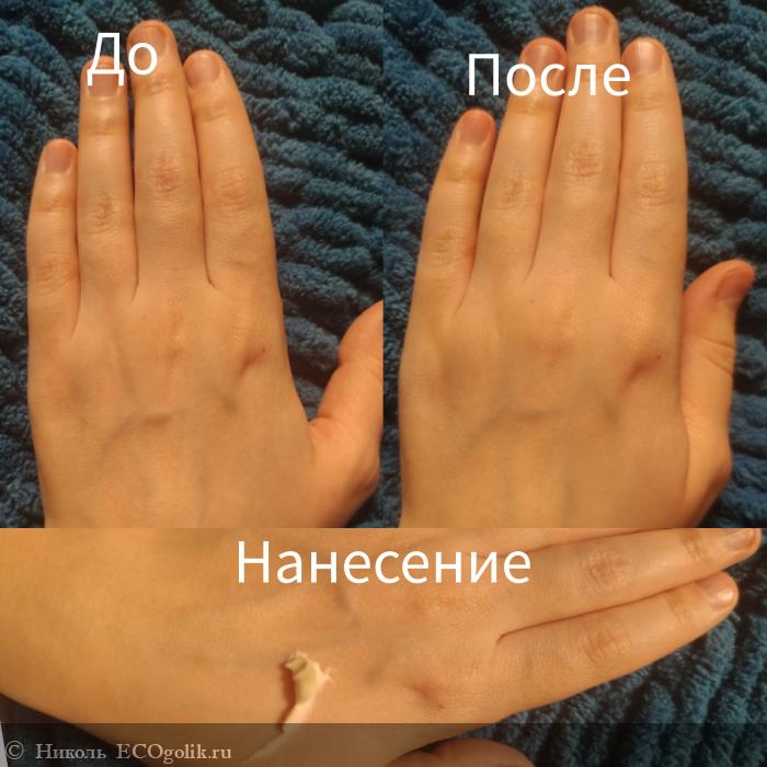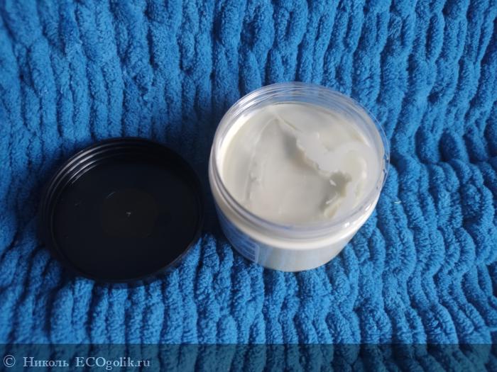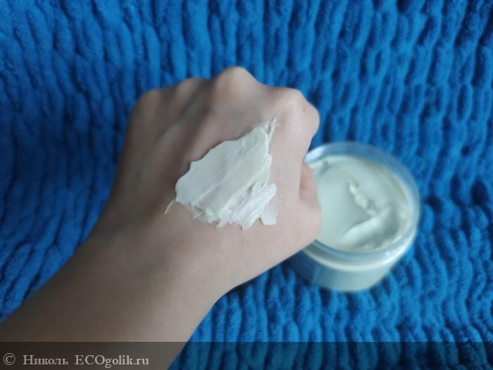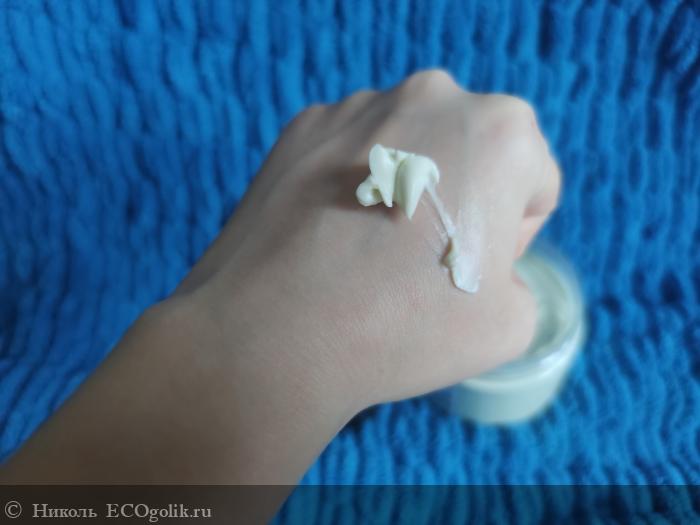 Цвет у этого уходового продукта имеет совсем лёгкий зелёный оттенок. От пальчика или шпателя остаётся след.