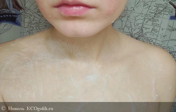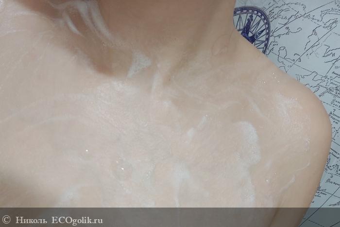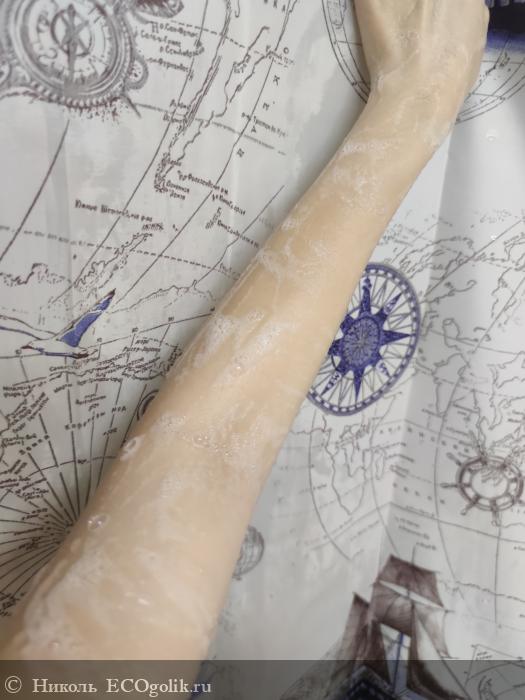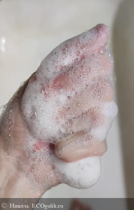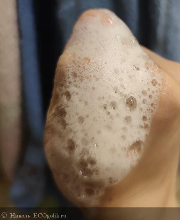 - Пенится отлично за счёт таких ПАВ, как: кокоглюкозид, лаурилглюкозид, кокосульфат натрия, кокамидопропилбетаин. На вид облачко пены небольшое, но это лишь на вид. Пенка неустойчивая, поэтому поймать сложно, когда пенка, как большое облачко.