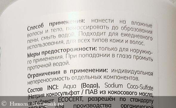 - Способ применения: нанести на влажные волосы и тело, помассировать до образования пены, смыть водой. Подходит для ежедневного использования, для всех типов кожи и волос.