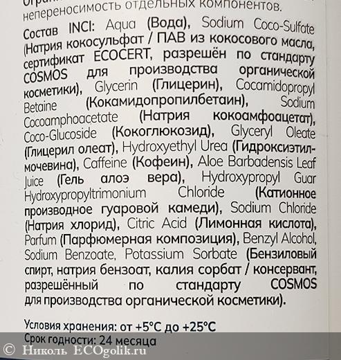 Описание шампунь-геля и действий компонентов, входящих в его состав. А так же написан какой результат ждать от средства. Имеется информация про его ингредиенты (98% компонентов природного происхождения) и консерванты (те, что используются в составе, разрешены по стандарту COSMOS для производства органической, натуральной косметики), официальный сайт. Надпись, что косметика бренда не тестируется на животных - всё это указано на этикетке, приклеенной на флакончик.