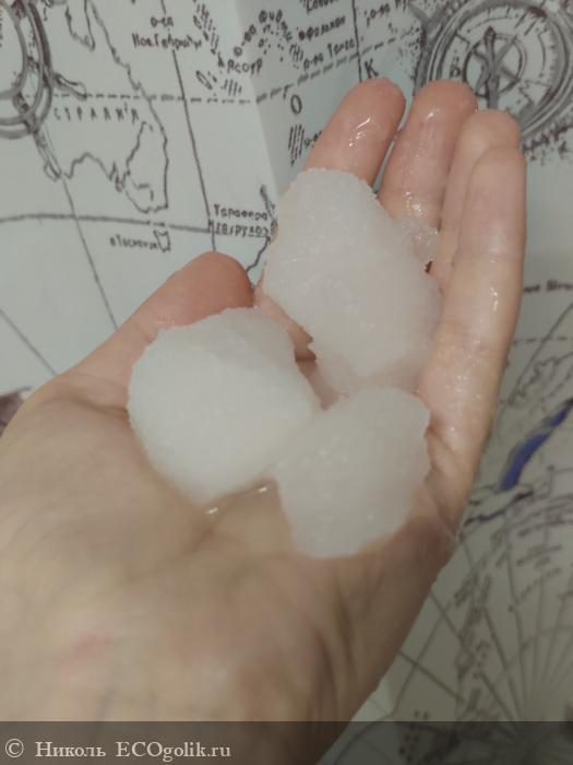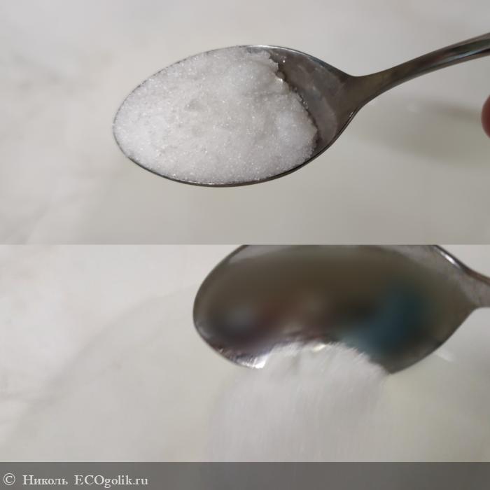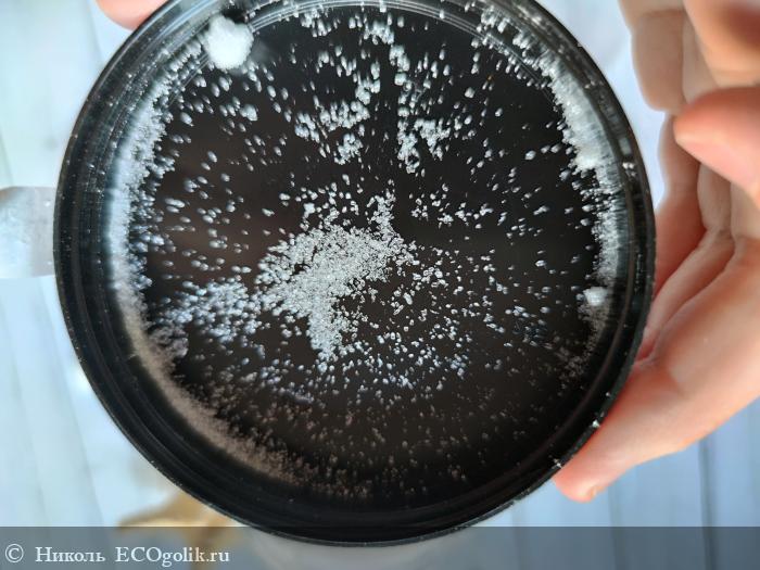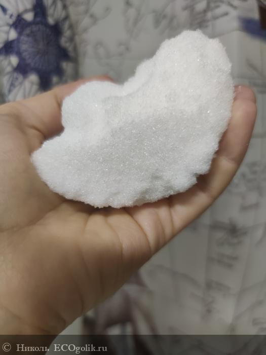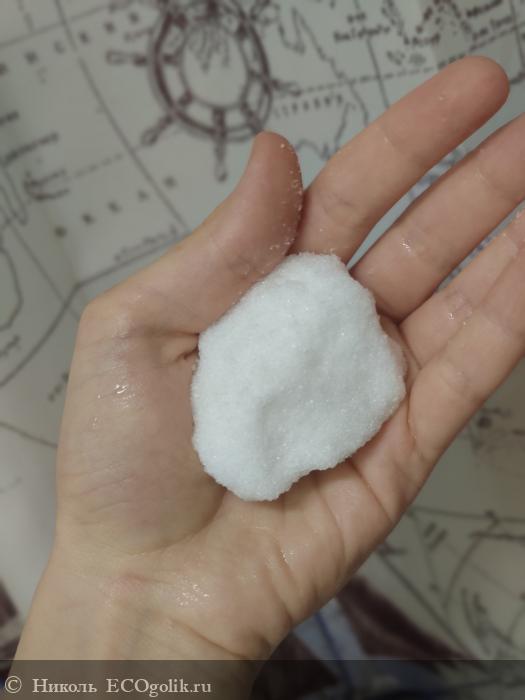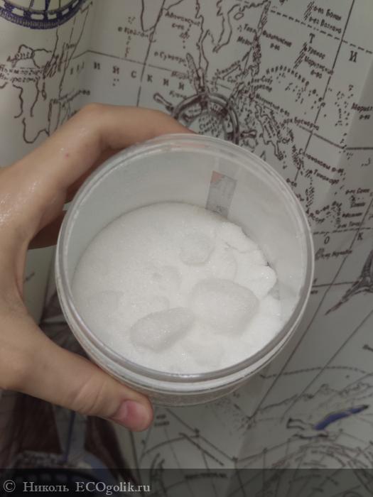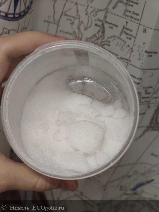 Сама соль белого цвета. Кристаллики соли чистые, сухие. Крупинки не острые, кожу не царапают. В банке соль чуть слипшиеся, но это не доставляет дискомфорта в её извлечении.