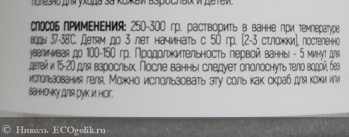 После указан способ применения: 250-300 гр. растворить в ванне при температуре воды 37-38°C. Детям до 3 лет начинать с 50 гр. (2-3 ст.ложки), постепенно увеличивая до 100-150 гр.