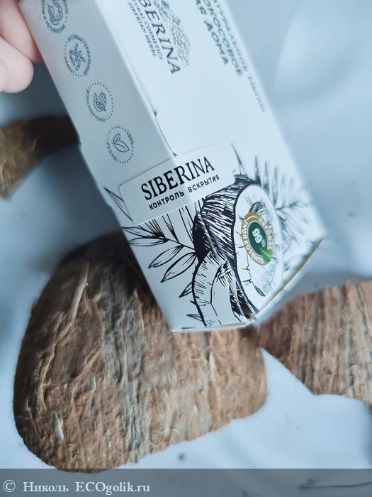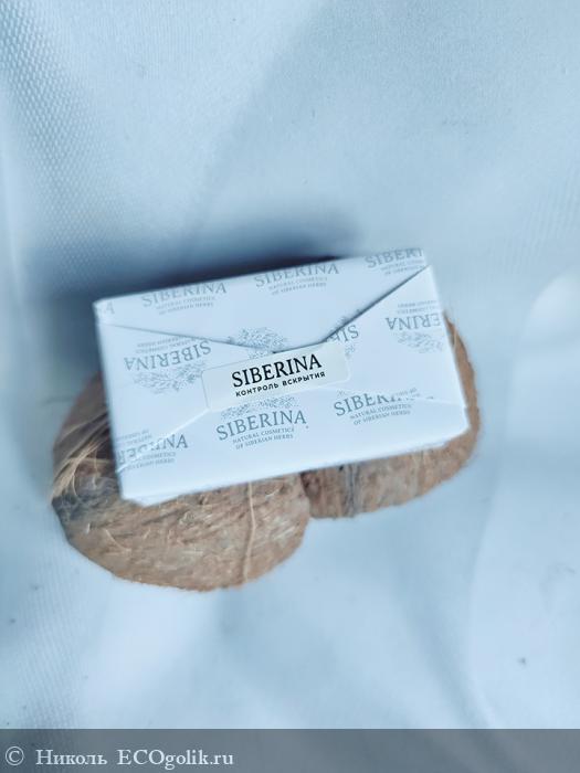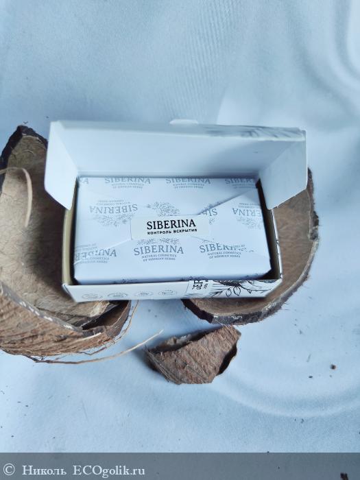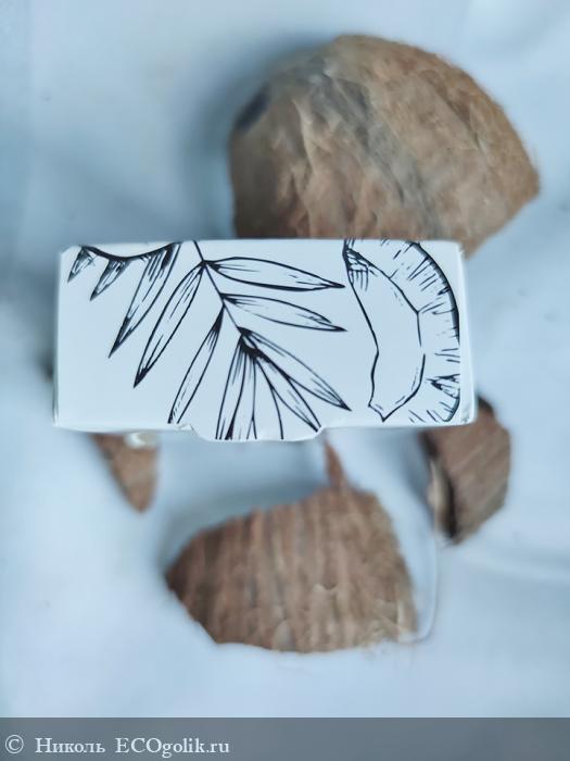 Это мыло хранится в картонной коробочке с красивым и минималистичным оформлением. На коробке красуются изображения кокоса и пальмовой веточки, имеется логотип бренда SIBERINA.