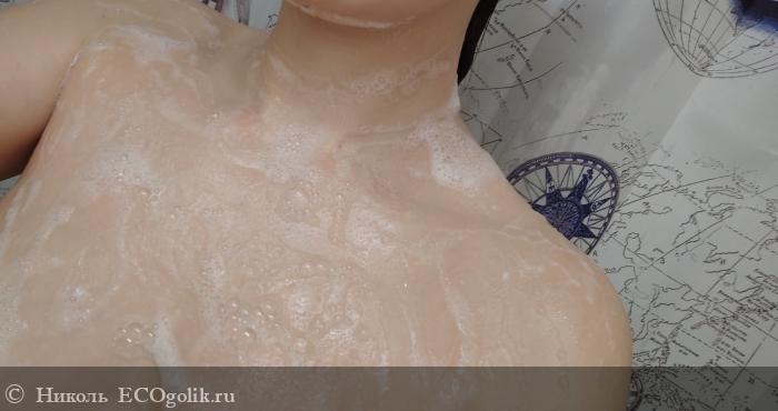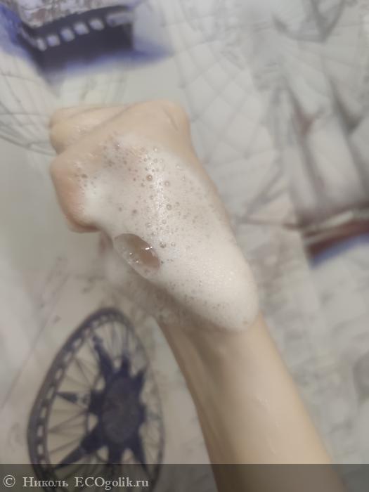- Хорошо пенится за счёт натриевых солей жирных кислот пальмового, оливкового, кокосового масел. Пена получается лёгкая и нежная, её достаточно для качественного очищения.