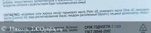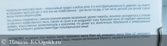 - Напечатан состав натуральный на 99%, он прекрасен, в нём: (натриевые соли жирных кислот пальмового масла, оливкового, кокосового масел, вода дистиллированная, глицерин растительный, пищевой ароматизатор "Кокос").