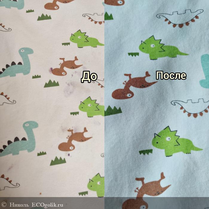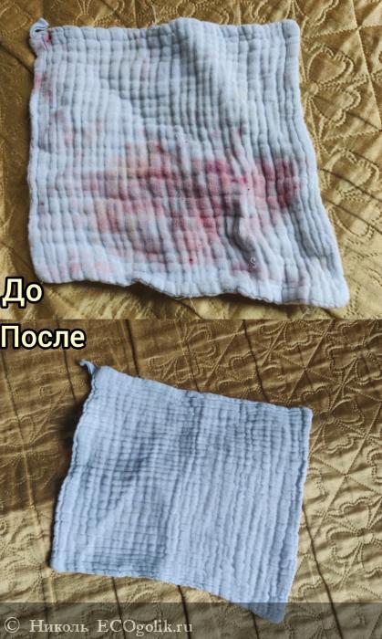 - Прекрасно отстирывает вещи от следов ягодок, песка, земли, пота. Покажу эффект на многоразовой, хлопковой, непромокаемой, детской пелёнке. Были пятна от голубики. После стирки от них не осталось и следа. Освещение немного подвело, но самое главное, результат виден, что меня обрадовало.