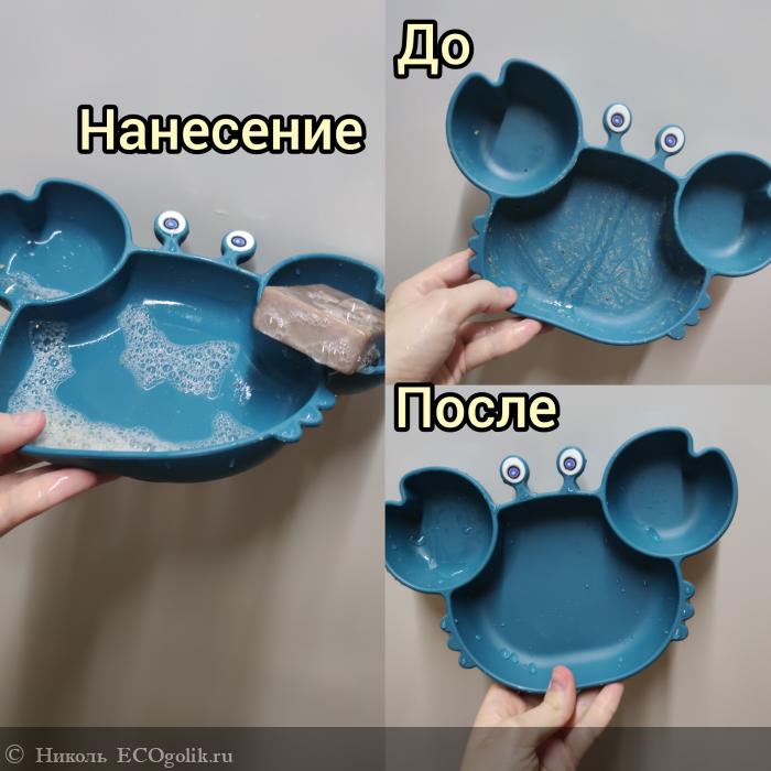 - Замечательно очищает посуду и столовые приборы от различных загрязнений, жира, масла, ягод, засохшей пищи. (В белой миске были следы от ягодок и в тёмной мисочке засохший булгур со специями и с мясом.)