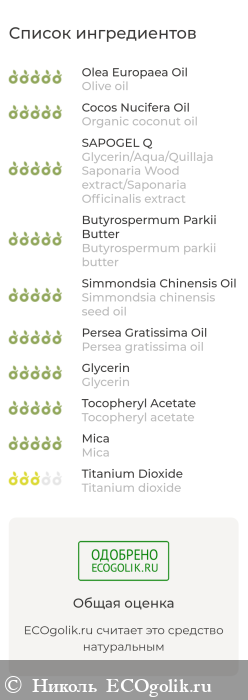 - Масло кокосовое питает, смягчает, придаёт блеск, обладает антиоксидантным, противовоспалительным и тонизирующим действиями, придаёт аромат.