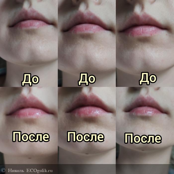 Впечатления от нанесения: Маслице быстро распределяется по губам, не течёт с них, не оставляет жирной плёночки или липкости. К губкам не прилипают волоски. Впитывается в течение нескольких минут, не сразу. У кого сухая кожа, впитываться будет быстро. (На губах шрам небольшой у меня от болячки, которая была в детстве, а не от пирсинга, как многие думают.)