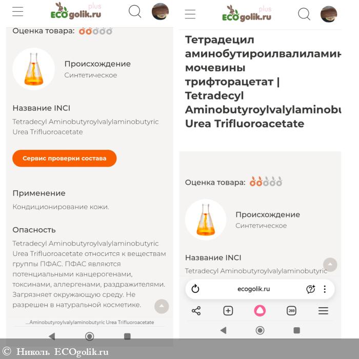 - Tetradecyl aminobutyroylvalylaminobutyric urea trifluoroacetate (тетрадецил аминобутироилвалиламинобутират мочевины трифторацетат) кондиционирует. Tetradecyl Aminobutyroylvalylaminobutyric Urea Trifluoroacetate относится к веществам группы ПФАС. ПФАС являются потенциальными канцерогенами, токсинами, аллергенами, раздражителями. Загрязняет окружающую среду. Не разрешен в натуральной косметике.