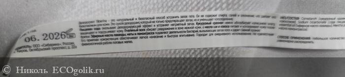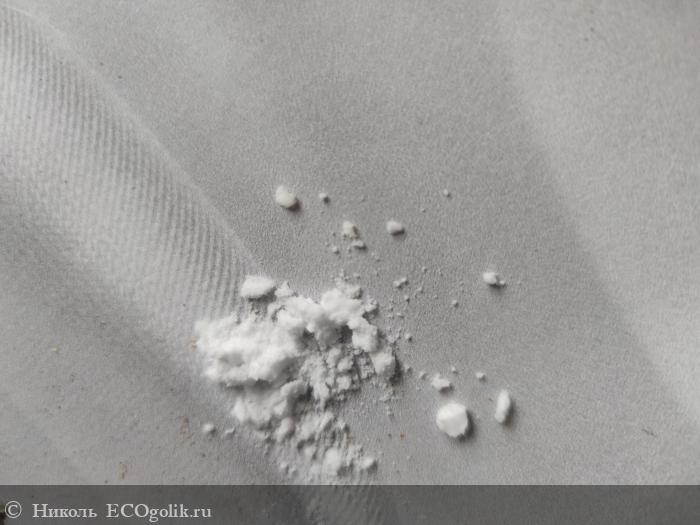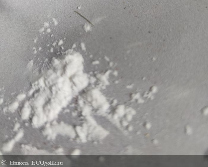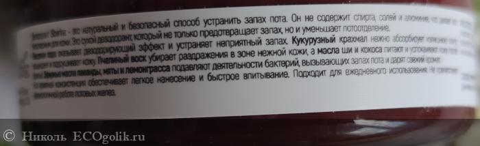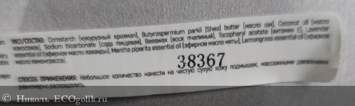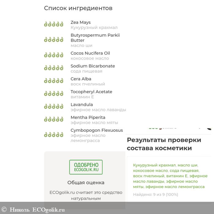 В нём присутствуют такие ингредиенты, как: кукурузный крахмал и сода, 2 масла (ши и кокоса) и 3 эфирных масла (лаванды, мяты, лемонграсса), есть витамин Е.