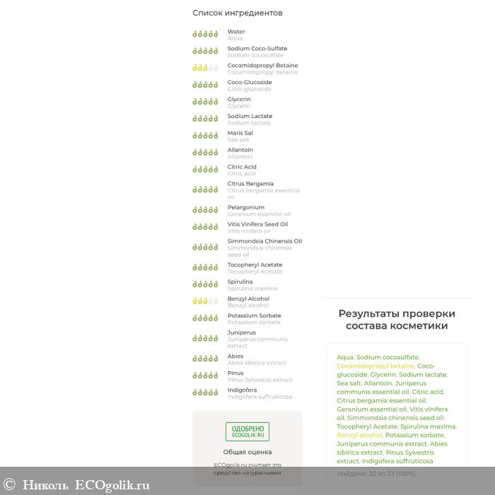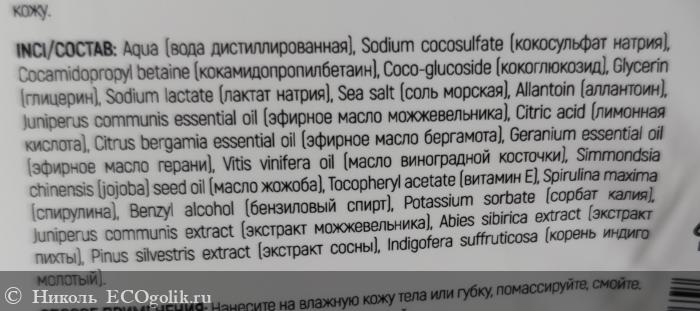 В нём кучу полезных компонентов: 3 эфирных масла (можжевельника, бергамота, герани), 2 масла (виноградной косточки и жожоба), компоненты, дающие цвет средству и не только - экстракт спирулины и корень индиго молотый), витамин Е, аллантоин, морская соль, 3 экстракта хвойных растений (можжевельника, пихты и сосны), глицерин и много других ингредиентов. Составчик написан на английском и на русском языках.