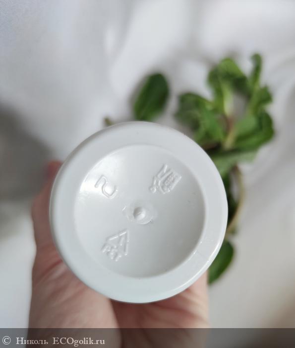 Сбоку флакончика имеются значки переработки: крышки (она изготовлена из полипропилена) и флакона. Ещё есть знак кролика, обозначающий, что продукция бренда не тестируется на животных. Есть штриховой код. В правом верхнем углу напечатан QR-код, наведя камеру телефона на него, он перенесёт Вас на карточку этого средства, которая находится на официальном сайте бренда, там будет расписана вся подробная информация про этот уходовый продукт.