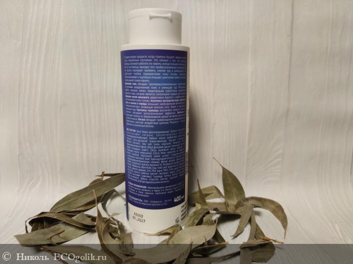 Этот шампунь хранится в большом, пластиковом флаконе, в объёме 400 мл, на который наклеена влагоустойчивая наклейка синего цвета с небольшим орнаментом.
