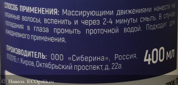 Вся необходимая информация про шампунь указана на влагоустойчивой наклейке, приклеенной на флакончик. Текст написан белым шрифтом оптимального размера на синем фоне. Информация грамотно структурирована и разделена на пункты. Каждый пунктик выделен жирным, белым шрифтом.