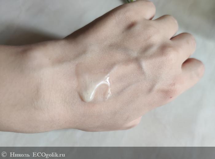 У уходового продукта жидкая консистенция гелевой текстуры с бежевым оттенком. По волосам распределяется легко, но важно найти свою правильную дозировку средства.