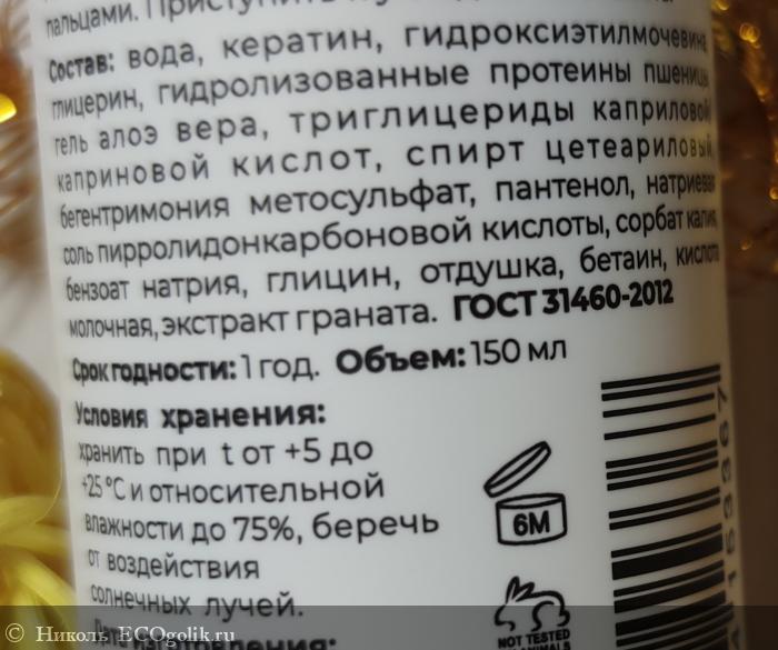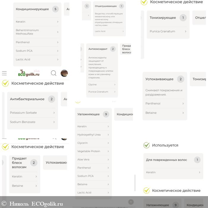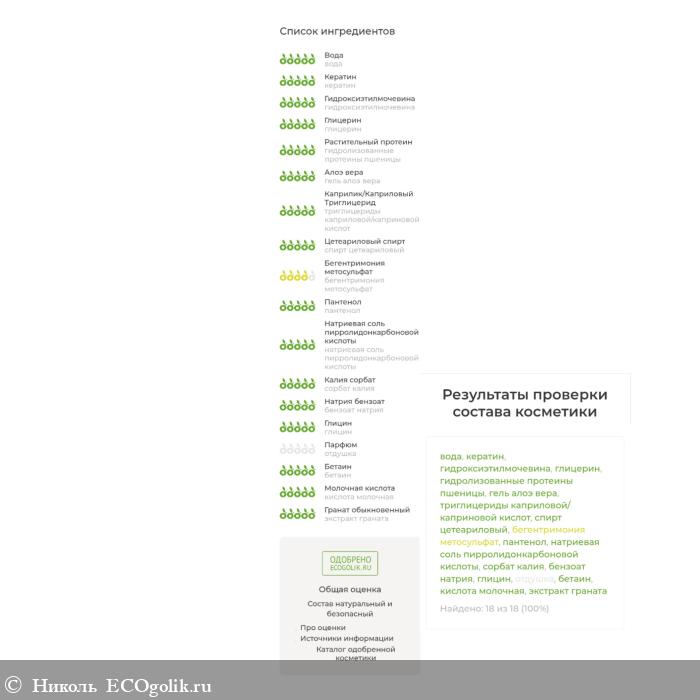 Состав одобрен этим сайтом. Этот крем входит в каталог одобренной косметики. В нём: вода, кератин, гидроксиэтилмочевина, глицерин, гидролизованные протеины пшеницы, гель алоэ вера, триглицериды каприловой/каприновой кислот, спирт цетеариловый, бегентримония метосульфат, пантенол, натриевая соль пирролидонкарбоновой кислоты, сорбат калия, бензоат натрия, глицин, отдушка, бетаин, кислота молочная, экстракт граната.