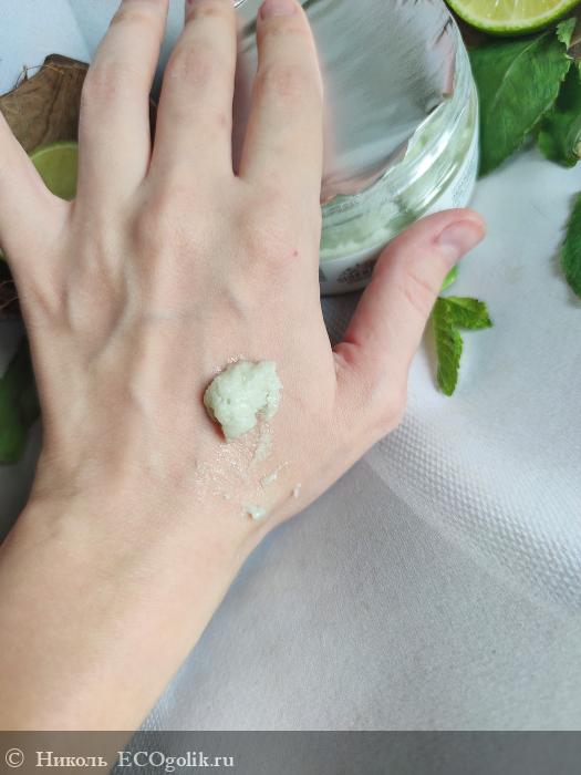 Аромат у гель-скраба в меру насыщенный, чётко чувствуются нотки ментола и мяты, а в шлейфе слабо ощущаются лаймовые ноты.