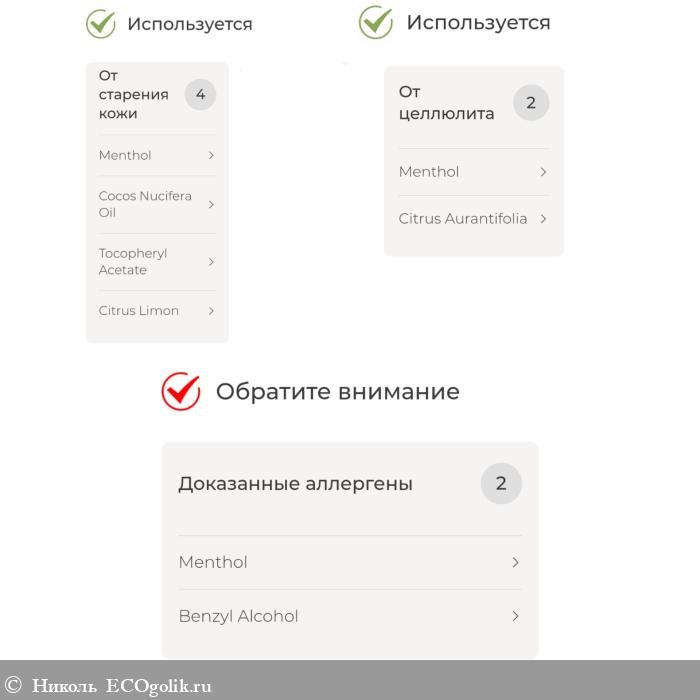 Проверка выявила доказанные аллергены: бензиловый спирт и ментол . Но сразу отмечу, у меня не было аллергической реакции. Есть компоненты, помогающие от старения кожи и от целлюлита.