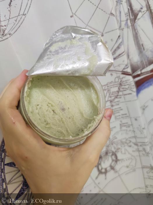 На самой крышке и баночке наклеены влагоустойчивые наклейки со всей информацией об этом средстве. На крышечке напечатано название серии, к которой относится этот уходовый продукт. Имеется наклеечка с QR-кодом. Так же красуется логотип бренда и написано, что это натуральный охлаждающий гель-скраб для проблемных зон с ментолом и лаймом. Снизу указано, что создано из компонентов высокого качества. Не содержит SLS, парабенов, искусственных консервантов, ароматизаторов, красителей.