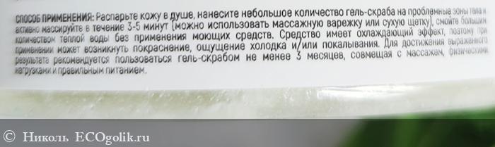 В этом пункте производитель подробно расписал всё. Перед использованием гель-скраба важно распарить кожу в душе. Наносить на проблемные зоны тела нужно массажными движениями в течение 3-5 минут. Во время применения этого средства советуют использовать массажную варежку, я иногда использовала рукавичку кесе, но можно и сухую щетку. Смывать уходовый продукт нужно большим количеством тёплой воды без применения геля или мыла.
