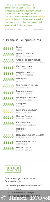 - Aloe Barbadensis Leaf Juice (органический гель алоэ вера) увлажняет, успокаивает, обладает противовоспалительным, заживляющим действиями.