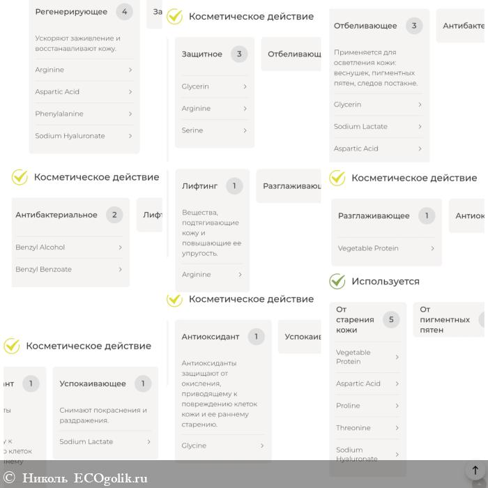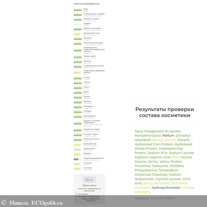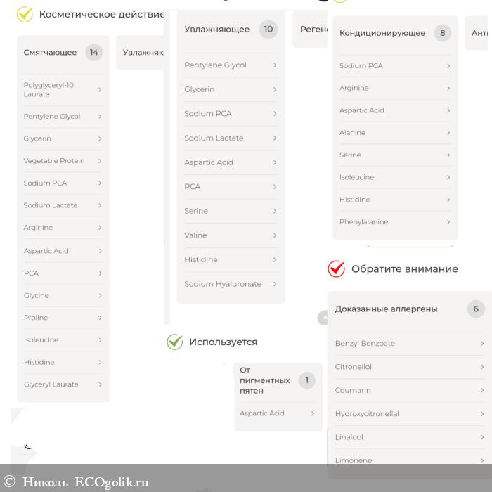 Состав неплохой. В нём хочется выделить следующие полезные ингредиенты такие как: пентилен гликоль, глицерин, полиглицерил-10 лаурат, гидролизованные протеины (кукурузы, пшеницы и сои), аргинин, глицин, аланин, серин, валин, пролин, треонин, изолейцин, гистидин, аспарагиновая кислота, гиалуронат натрия, фенилаланин, натрия лактат, натриевая соль пирролидонкарбоновой кислоты, пирролидонкарбоновая кислота, лимонная кислота.