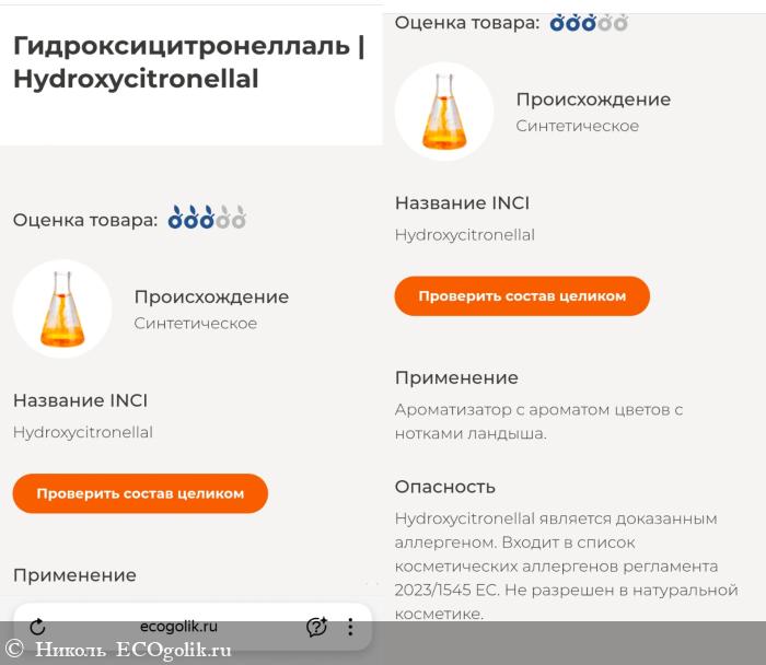 - Citronellol (цитронеллол) - ароматизатор (создает свежий цветочный тон, напоминающий запах срезанной кожицы зеленого яблока с легкими цитрусовыми нотками). Доказанный аллерген.