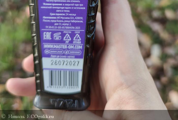 Вся необходимая информация про спрей указана на влагоустойчивой наклейке. Текст написан белым шрифтом на фиолетовом фоне. Он легко читаем. Информация грамотно структурирована и разделена на пункты, каждый пунктик выделен жирным, белым шрифтом.