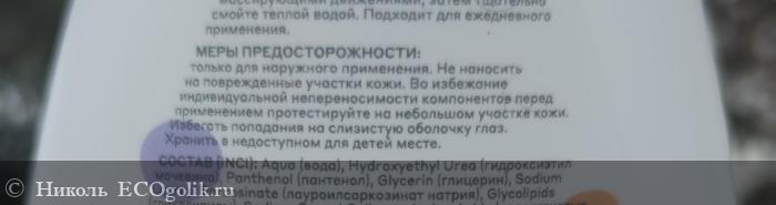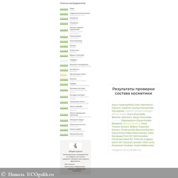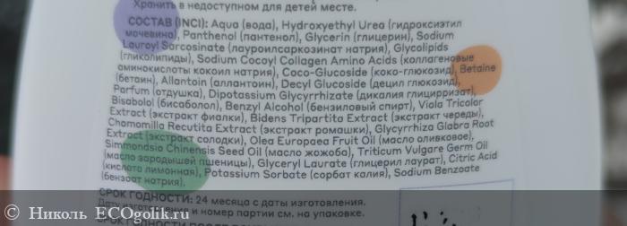 В составчике: Aqua (вода), Hydroxyethyl Urea(гидроксиэтил мочевина), Panthenol (пантенол), Glycerin(глицерин), Sodium Lauroyl Sarcosinate (лауроилсаркозинатнатрия), Glycolipids (гликолипиды), Sodium Cocoyl CollagenAmino Acids (коллагеновые аминокислоты кокоил натрия), Coco-Glucoside (коко-глюкозид), Betaine (бетаин), Allantoin(аллантоин), Decyl Glucoside (децил глюкозид), Parfum(отдушка), Dipotassium Glycyrrhizate (дикалия глицирризат), Bisabolol (бисаболол), Benzyl Alcohol (бензиловый спирт), Viola Tricolor Extract (экстракт фиалки), Bidens TripartitaExtract (экстракт череды), Chamomilla Recutita Extract(экстракт ромашки), Glycyrrhiza Glabra Root Extract(экстракт солодки), Olea Europaea Fruit Oil (масло оливковое), Simmondsia Chinensis Seed Oil (масло жожоба), Triticum Vulgare Germ Oil (масло зародышей пшеницы), Glyceryl Laurate (глицерил лаурат), Citric Acid (кислота лимонная), Potassium Sorbate (сорбат калия), SodiumBenzoate (бензоат натрия).