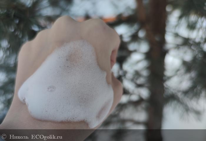 - Пенообразование классное. Пена образуется за счёт таких ПАВ, как: лауроилсаркозинат, натриякоко-глюкозид, децил глюкозид, глицерил лауратя софокол.