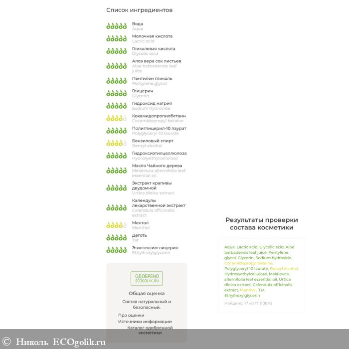 Состав классный. В нём нет силиконов минерального масла, парабенов, сульфатов, ПЭГ, искуственных красителей и консервантов, синтетических ароматизаторов. Состав похож на кислотный пилинг, только отличие в том, чтобы этом есть березовый дёготь и нет эфирного масла мяты.
