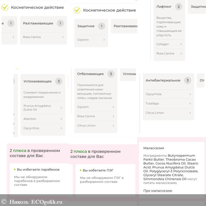 Сначала дано описание крем, в котором расписаны действия нескольких компонентов, входящих в его состав.
