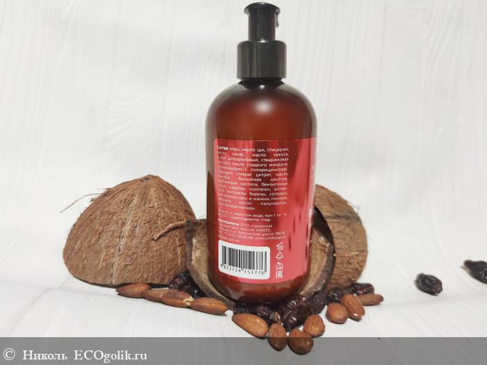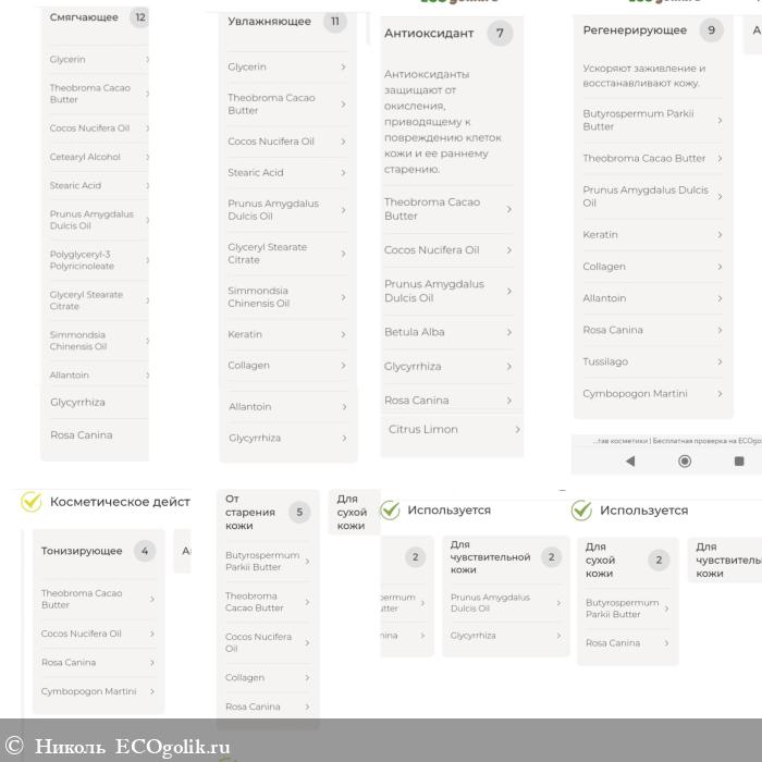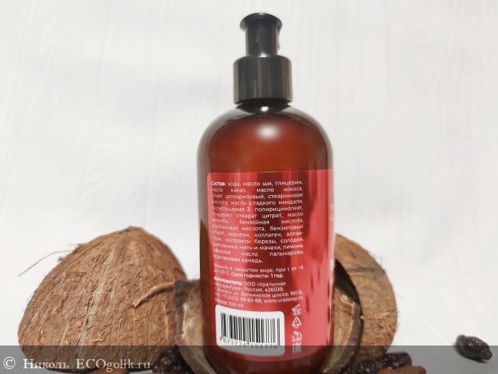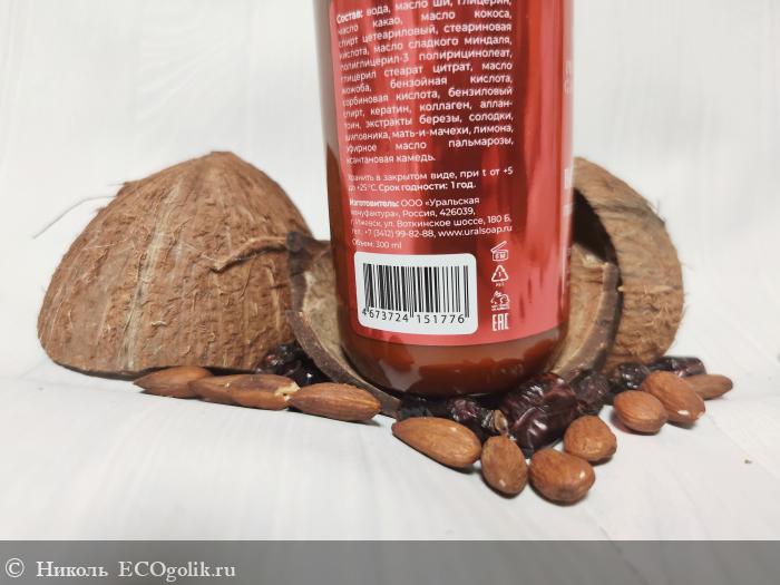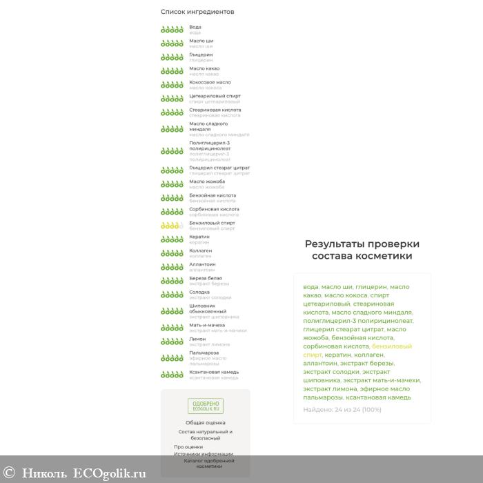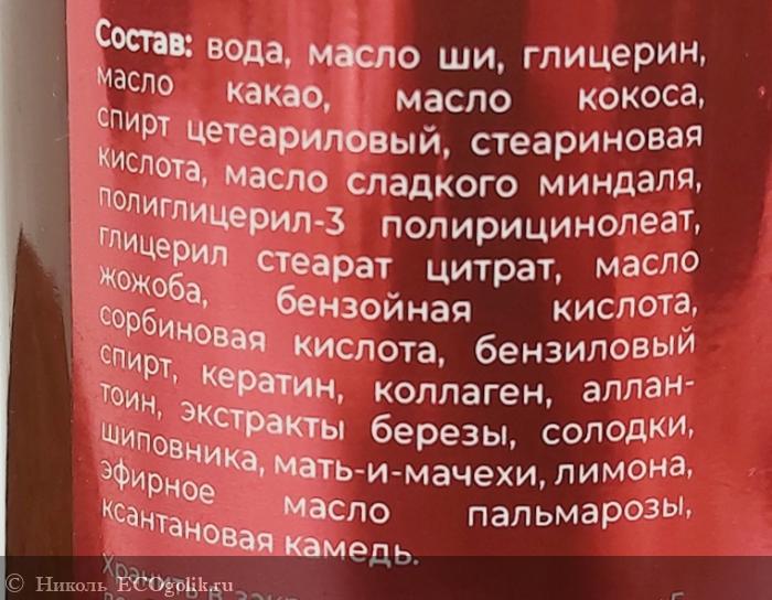 В составе: вода, масло ши, глицерин, масло какао, масло кокоса, спирт цетеариловый, стеариновая кислота, масло сладкого миндаля, полиглицерил-3 полирицинолеат, глицерил стеарат цитрат, масло жожоба, бензойная кислота, сорбиновая кислота, бензиловый спирт, кератин, коллаген, аллантоин, экстракты березы, солодки, шиповника, мать-и-мачехи, лимона, эфирное масло пальмарозы, ксантановая камедь.