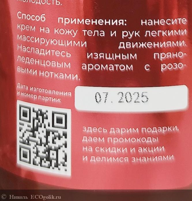 - После указан способ применения: наносите крем на кожу тела и рук легкими массирующими движениями. Насладитесь изящным пряно-леденцовым ароматом с розовыми нотками.