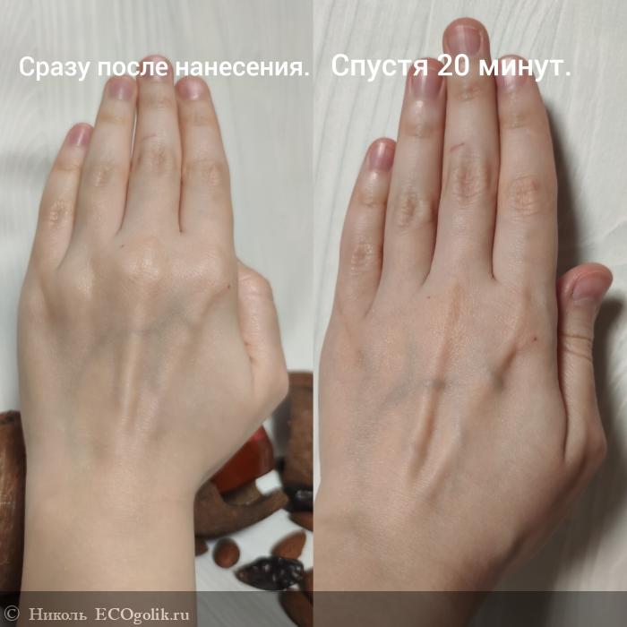 Сначала кожа чуть блестит после нанесения кремушка, но после полного впитывания в кожу, блеск исчезает. Чуть освещение отличается, но несмотря на такую текстуру и насыщенность состава, ощущения тяжести на коже я не почувствовала, так же после крема нет липкости, ощущения масляной плёнки.